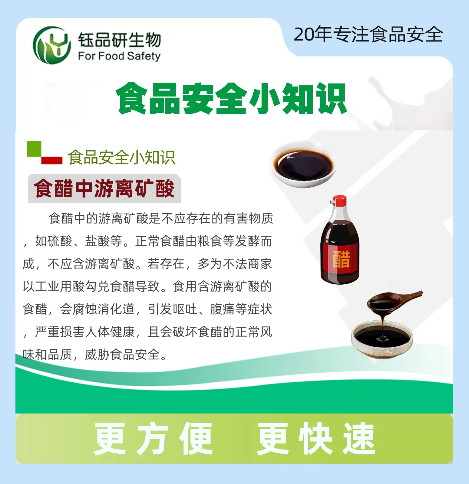 食醋中主要成分是乙酸(含量在3.5%以上),同时也含有其他少量的有机酸。GB2719-2003《食醋卫生标准》规定食醋中的游离矿酸(硫酸、盐酸、硝酸、磷酸等无机酸及有机酸草酸等)为不得检出。而以非食用酸配制的醋或被污染过的食用醋中经常含有游离矿酸,消费者食用以后,会造成消化不良、腹泻,如果长期食用会危害身体健康。