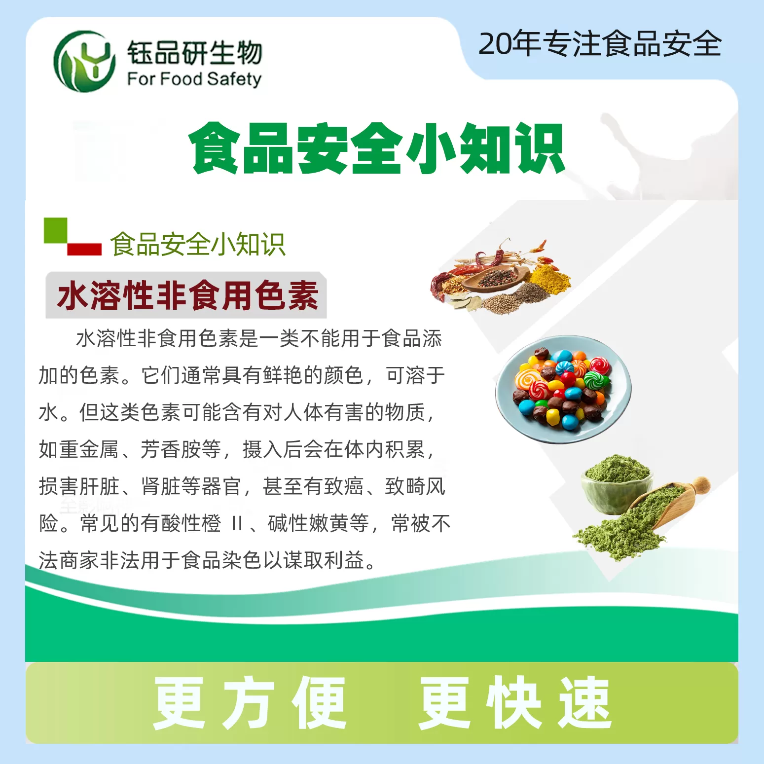 1简介 色素(着色剂)分为水溶性色素和油溶性色素。我国允许使用的食用色素有50多种,而已知的非食用色素有3000多种,作为盲样,要想鉴别含有哪种色素是很困难,需要付出相当大的工作量。本方法是水溶性的非食用色素筛选方法,适用于罗丹明B等非食用色素的快速筛选。