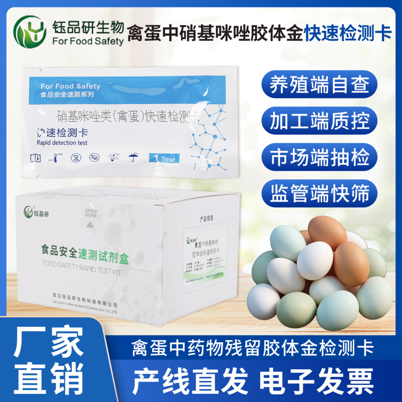 武汉钰品研生物专注于食品安全快速检测领域,深耕检测试剂、试纸及胶体金检测卡等产品研发与生产,其推出的硝基咪唑快检卡严格遵循行业标准,确保检测结果的准确性与可靠性。该快检卡适用于各类禽蛋样品,从鸡蛋、鸭蛋到鹌鹑蛋等,均可快速完成检测,帮助社区团购商家在源头把控禽蛋品质,从根本上减少不合格产品流入消费端的风险。