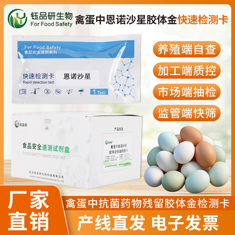 武汉钰品研生物专注于食品安全快速检测试剂、试纸及胶体金检测卡的研发与生产,致力于为行业提供高效可靠的检测解决方案。其研发的胶体金检测卡,严格遵循检测标准,确保检测结果的准确性与稳定性,能够对样本中的微量恩诺沙星残留进行精准识别,帮助企业自检、监管部门抽检时快速锁定问题,从根本上杜绝不合格产品流入市场。