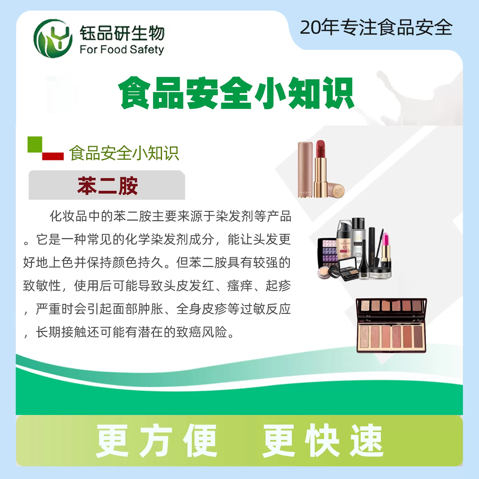 【选择理由】随着化妆品与纺织品安全监管日益严格,苯二胺作为高风险禁用/限用物质的精准快速检测需求日益迫切。本苯二胺速测试剂盒以“快速、精准、易用、稳定”为核心优势,打破传统检测对设备与场地的限制,大幅降低检测门槛与成本,让每一次检测都高效可靠,为多领域安全管控防线保驾护航,是多场景苯二胺检测的实用型优选方案。