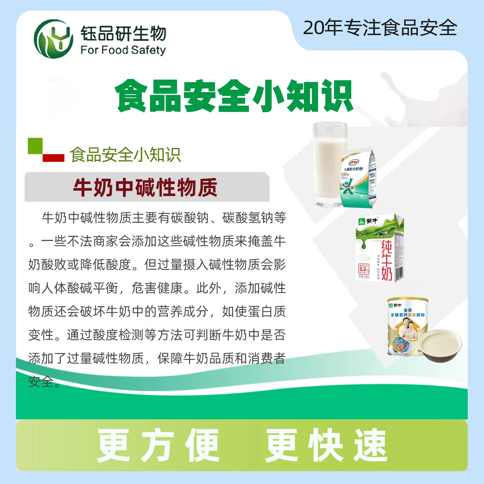 守护牛奶安全,从精准筛查开始!牛奶作为全年龄段的营养佳品,其天然酸度需维持在pH 6.5-6.7的平衡范围。但部分不良商家为掩盖牛奶酸败变质,会违规添加碳酸钠、碳酸氢钠等碱性物质,不仅破坏牛奶中的蛋白质、维生素等核心营养,还可能引发肠胃不适,长期摄入更会损害身体代谢功能。为筑牢牛奶安全防线,牛奶中碱性物质速测试剂盒应运而生,无需专业实验室,轻松实现快速、精准检测,让每一口牛奶都安心可靠。
