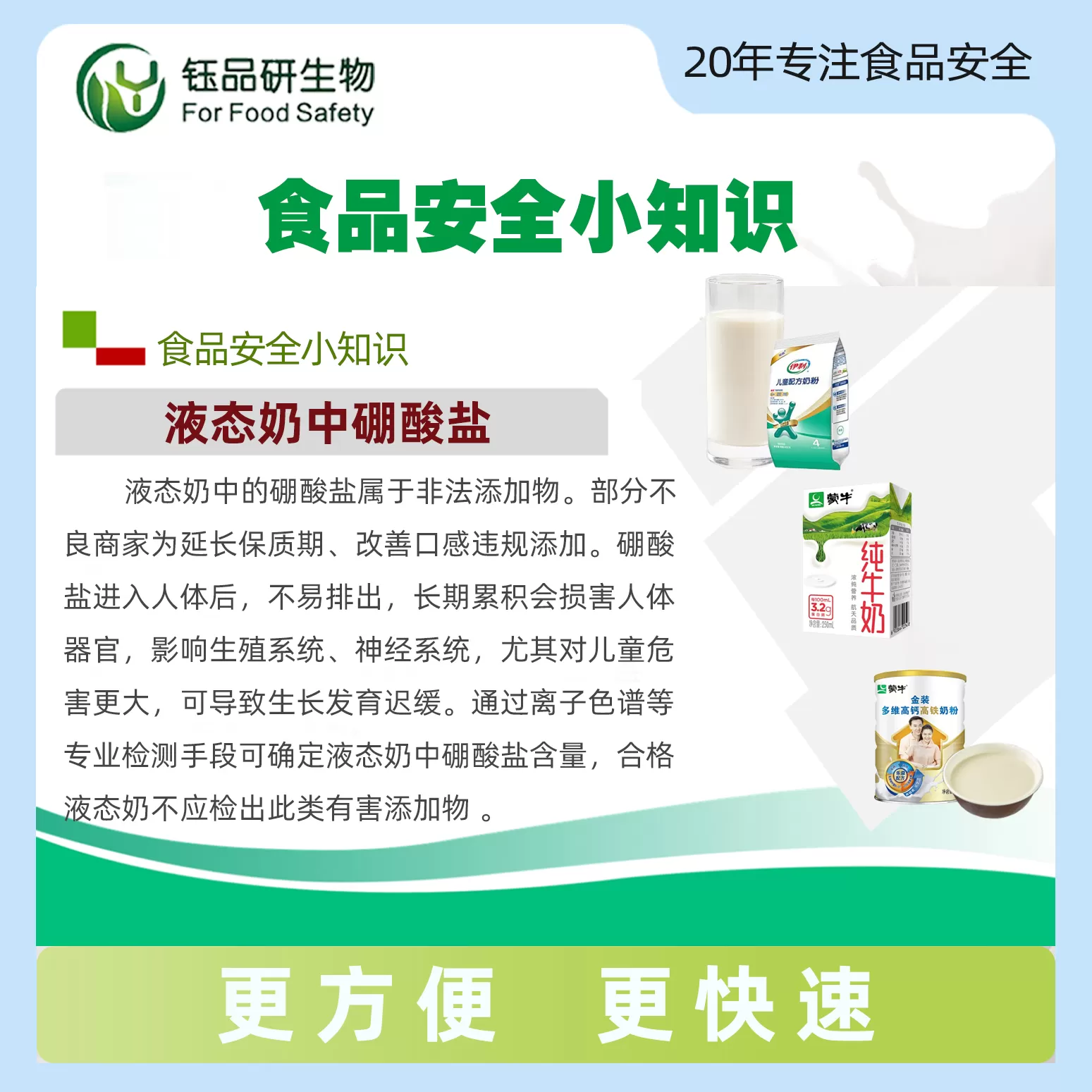 精准筛查硼酸盐残留,守护液态奶饮用安全!液态奶是全家日常营养补充的核心选择,其天然纯净度与安全品质直接关乎人体健康。硼酸盐(如硼砂、硼酸等)是国家明令禁止在食品生产加工中使用的有毒物质,但部分不法商家为延长液态奶保质期、改善口感、掩盖变质异味,违规在纯牛奶、低脂奶、脱脂奶、调制乳等各类液态奶中添加硼酸盐。长期饮用含硼酸盐残留的液态奶,会损害肝脏、肾脏功能,刺激胃肠道黏膜引发恶心、呕吐等不适,尤其对婴幼儿的生长发育造成严重危害,同时严重侵犯消费者知情权与合法权益。液态奶中硼酸盐速测试剂盒,专为液态奶中硼酸盐残留快速筛查设计,无需专业实验室与复杂设备,轻松实现便捷精准检测,为液态奶品质把控筑牢第一道防线,让每一口液态奶都天然安心。