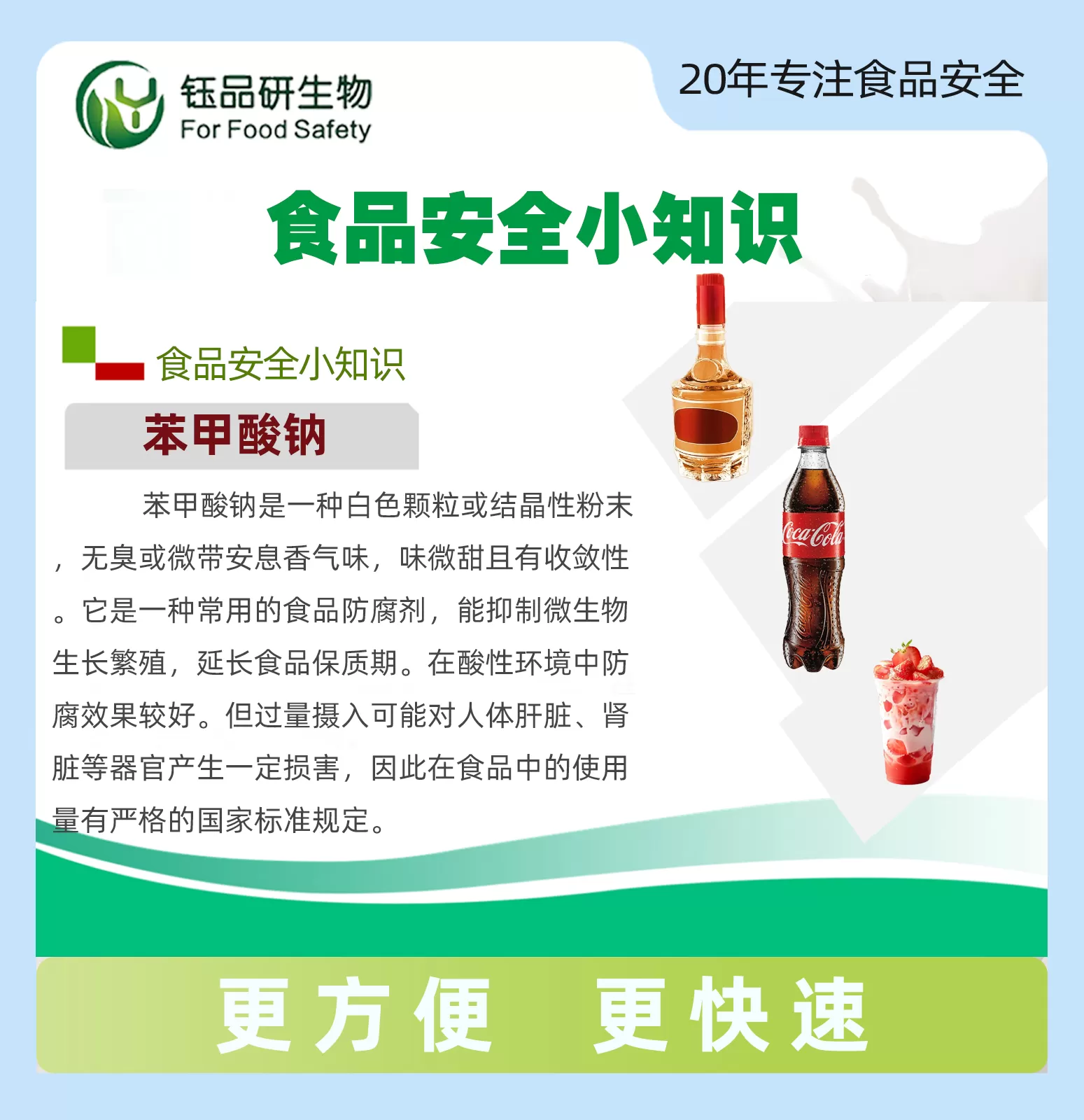 苯甲酸钠又称安息香酸钠,是一种酸性防腐剂,具有防腐效果好、在人体代谢快、低毒等优点,被广泛用于食品添加剂,用量过多会对人体肝脏产生危害,甚至致癌。本速测盒适用于饮料中苯甲酸钠含量的快速检测。