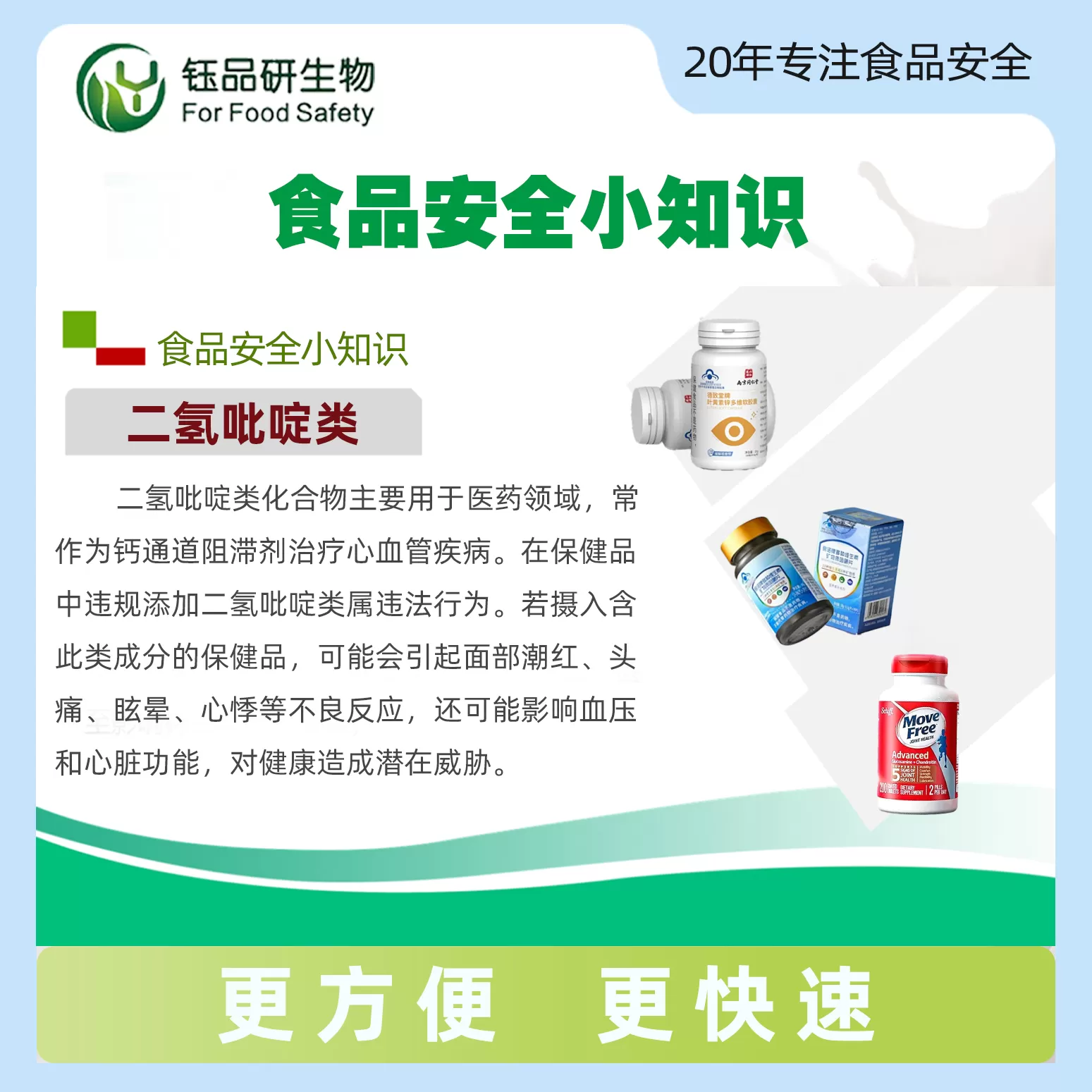 【技术原理】采用特异性显色反应技术,基于二氢吡啶类物质与专用检测试剂的特征性反应原理,可快速精准识别食品中的二氢吡啶类残留。检测灵敏度符合食品安全管控相关要求,能有效捕捉微量非法添加的二氢吡啶类成分,杜绝不合格食品流入消费市场,为食品安全筑牢第一道防线。
