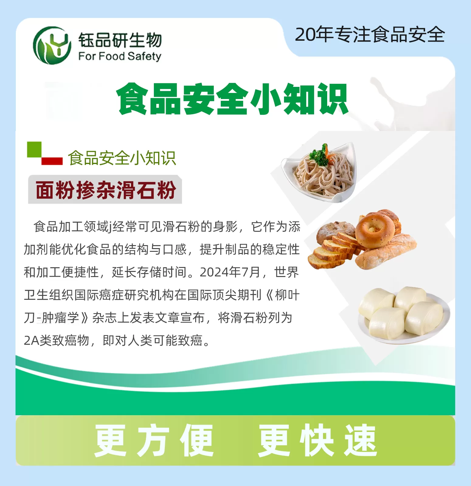 武汉钰品研生物推出面粉掺杂(滑石粉等)快速检测试剂盒,基于滑石粉等掺杂物质中的特定成分与检测试剂发生专属化学反应,产生特征现象(如颜色变化、沉淀生成等)的原理,能快速精准检测面粉中是否掺杂滑石粉等物质及掺杂量是否超标。操作简便,无需复杂专业设备,普通人员依照详细易懂的操作指南,短时间内即可完成检测,通过观察反应后的直观现象判读结果。滑石粉等掺杂物质无营养价值,长期食用掺杂此类物质的面粉会影响人体健康,还会破坏面粉的品质。该试剂盒适用于面粉生产加工企业质量把控、市场监管部门抽检、农贸市场快检、超市进货查验,以及家庭日常购买面粉时自查等场景。咨询热线 13720286360,武汉钰品研生物助力您精准识别面粉掺杂问题,守护食品品质与健康。...