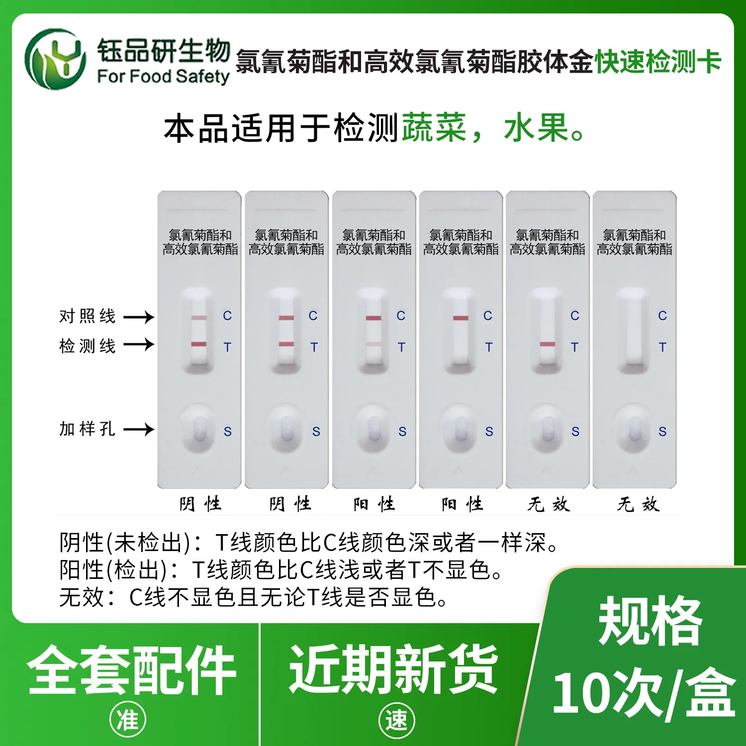 本产品应用竞争抑制胶体金免疫层析的原理制成,用于检测蔬菜、水果中氯氰菊酯农药残留。样本溶液滴入检测卡的加样孔后,样本溶液中的氯氰菊酯与金标抗体相结合,从而阻止金标抗体与纤维素膜上氯氰菊酯偶联物结合,通过C、T线的颜色深浅判断检测结果。