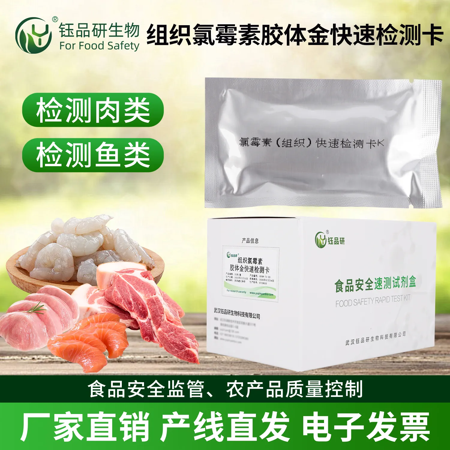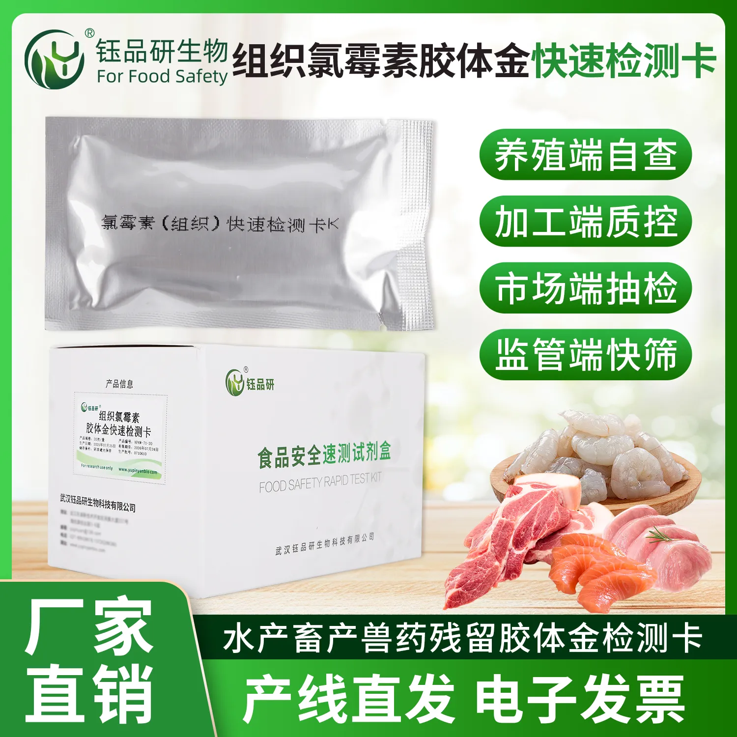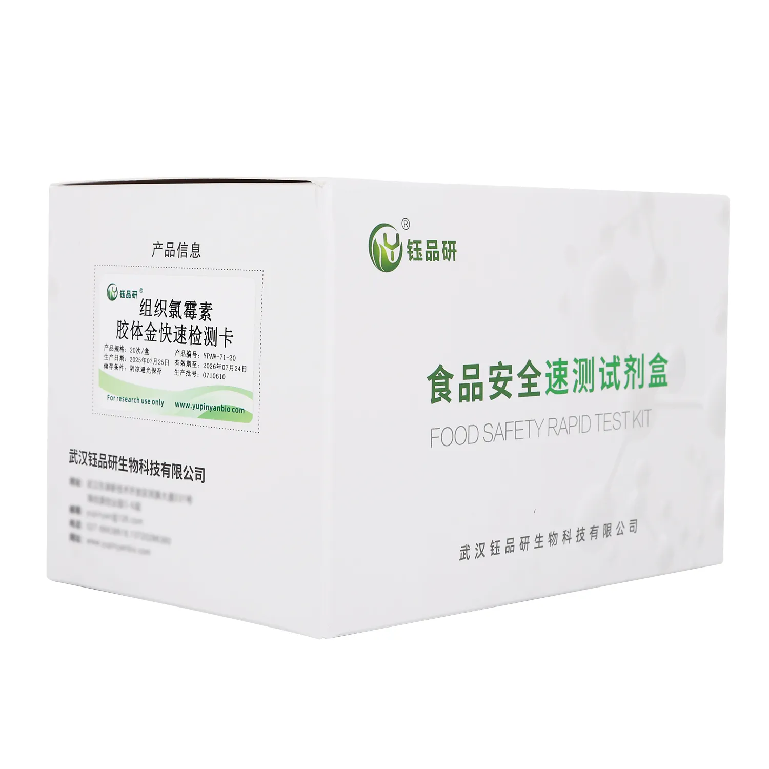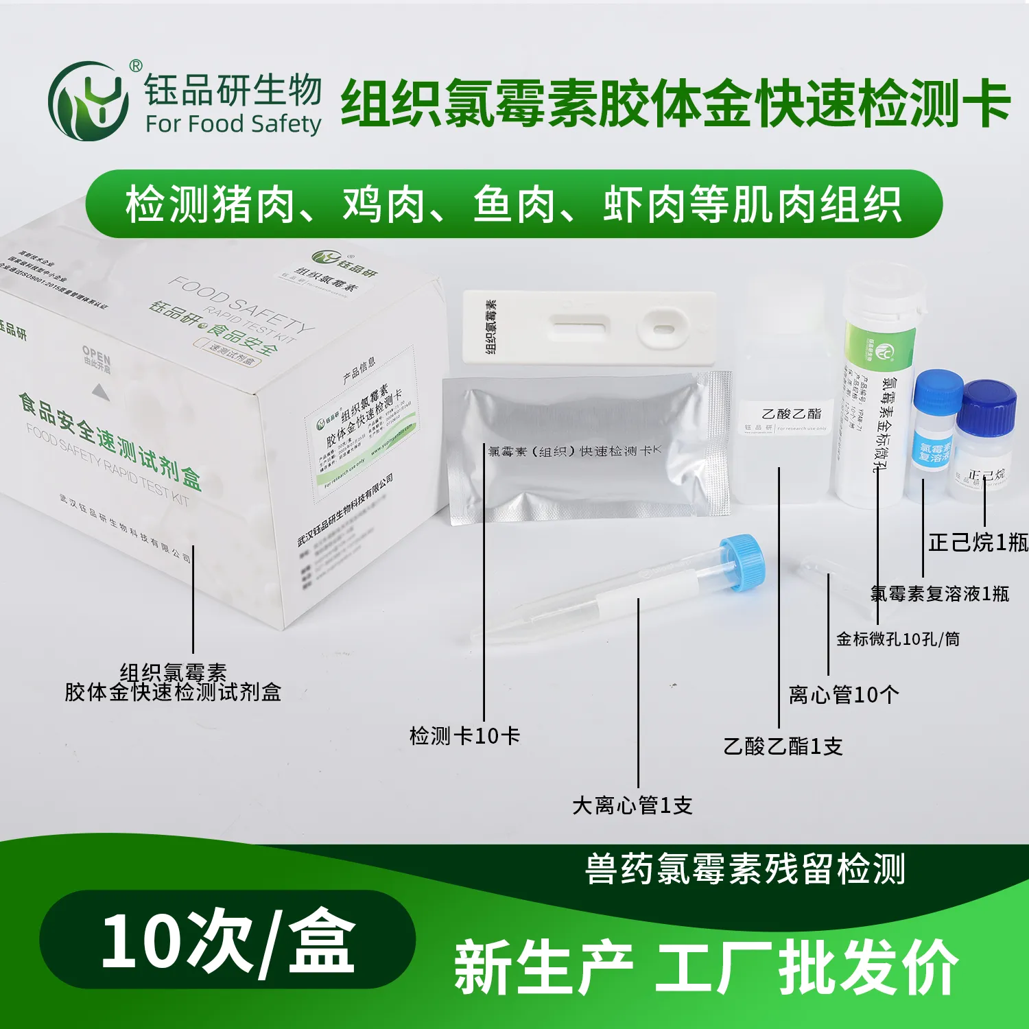 武汉钰品研生物氯霉素胶体金快检卡,基于竞争抑制免疫层析技术。检测微孔内冻干金标抗体,硝酸纤维素膜检测线(T 线)包被氯霉素抗原,对照线(C 线)包被羊抗鼠 IgG 二抗。样本中的氯霉素与金标抗体结合,抑制其与 T 线抗原结合,借 T 线颜色变化,10 分钟内判残留。操作简便,处理畜禽肉、水产品、蜂蜜等样本后滴加试剂即可,无需专业设备。氯霉素残留会抑制造血功能,致贫血、白细胞减少,我国严禁在食品动物中使用。适用于养殖、加工企业自检及监管抽检。咨询 13720286360,护食品安全。...