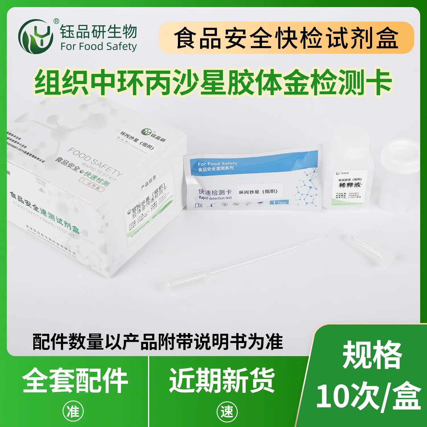 环丙沙星胶体金快检卡,基于竞争抑制免疫层析原理。检测微孔预冻干金标环丙沙星抗体,硝酸纤维素膜 T 线包被环丙沙星抗原,C 线包被羊抗鼠 IgG 二抗。简单处理畜禽肉、禽蛋、水产等样本后滴加试剂,样本中环丙沙星与金标抗体结合,抑制其与 T 线抗原结合,5 - 10 分钟借 T 线颜色判断残留。环丙沙星属氟喹诺酮类抗生素,残留超标会引发人体胃肠道不适、头痛头晕、过敏反应,长期摄入甚至影响儿童软骨发育。适用于养殖、加工企业自检及监管部门抽检。咨询 13720286360,武汉钰品研生物。...