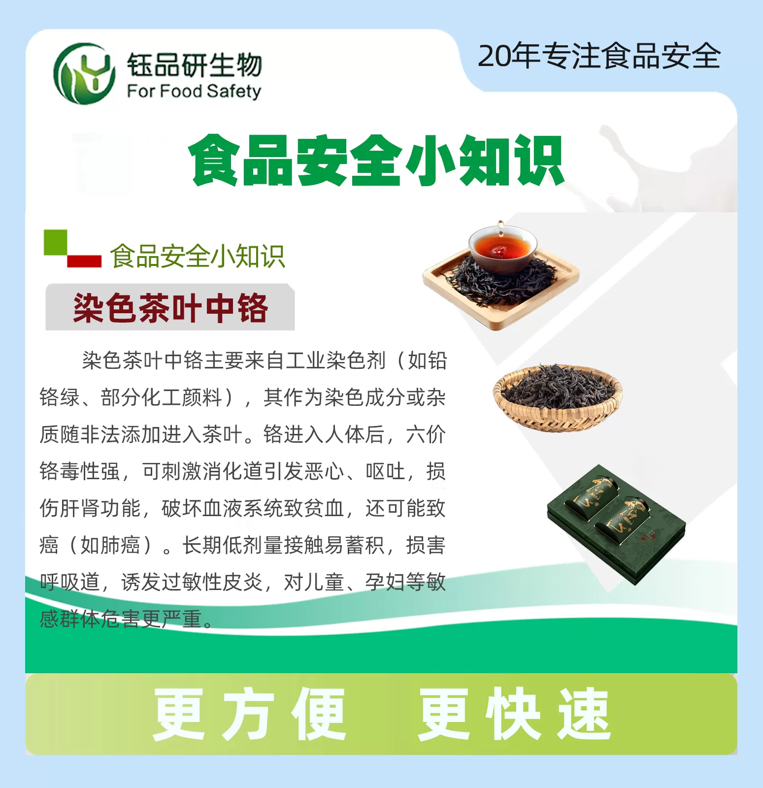 守护茶饮安全,精准辨别染色与铬残留!茶叶作为日常高频饮品,其安全品质直接关乎人体健康。部分不法商家为改善劣质茶叶外观色泽、掩盖霉变或杂质缺陷,违规添加工业染料进行染色;同时,茶叶种植过程中若土壤受铬污染、加工环节使用含铬器具,易导致铬残留。长期饮用含染色剂和铬残留的茶叶,会损害人体肝脏、肾脏代谢功能,干扰消化系统正常运作,铬的累积还可能诱发细胞损伤,尤其威胁长期饮茶人群的健康。染色茶叶铬辨别速测管,专为茶叶安全专项检测设计,可同步快速筛查染色剂与铬残留,无需专业实验室与复杂设备,轻松筑牢茶饮安全防线,让每一杯茶饮都安心醇厚。