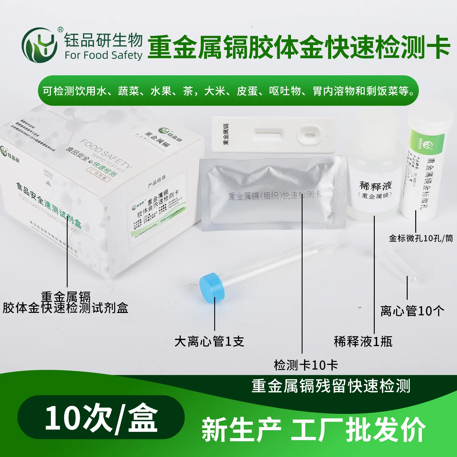 武汉钰品研生物重金属镉胶体金快检卡,基于竞争抑制免疫层析技术,样本中镉离子与胶体金标记抗体结合,抑制其与检测线偶联物结合,借 T 线颜色变化,10 分钟内快速判断残留情况。操作简便,无需专业设备,简单处理样本滴加试剂即可。镉具强毒性,长期摄入会损害肾脏、骨骼,甚至致癌。适用于农产品、水产品、食品加工企业自检、监管抽检等场景。咨询 13720286360,守护饮食安全。...