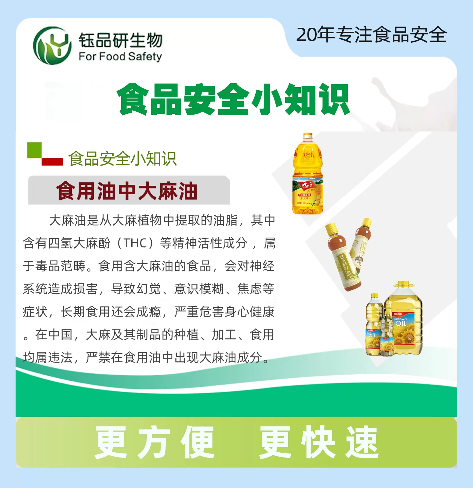 精准筛查大麻油掺杂,守护食用油纯正品质!食用油是日常烹饪的核心原料,其品质直接关乎饮食安全与健康。大麻油(大麻籽油)因来源特殊且部分成分具有成瘾性,被国家严格管控,禁止非法添加到食用植物油中。但部分不法商家为降低成本、以次充好,违规在大豆油、花生油、菜籽油、玉米油等食用植物油中掺杂大麻油,不仅破坏食用油的纯正风味,还可能对人体神经系统造成不良影响,损害消费者权益与健康。食用油中大麻油速测试剂盒,专为食用油中大麻油掺杂快速筛查设计,无需专业实验室与复杂设备,轻松实现便捷精准检测,为食用油品质把控筑牢第一道防线,让每一次烹饪都安心可靠。