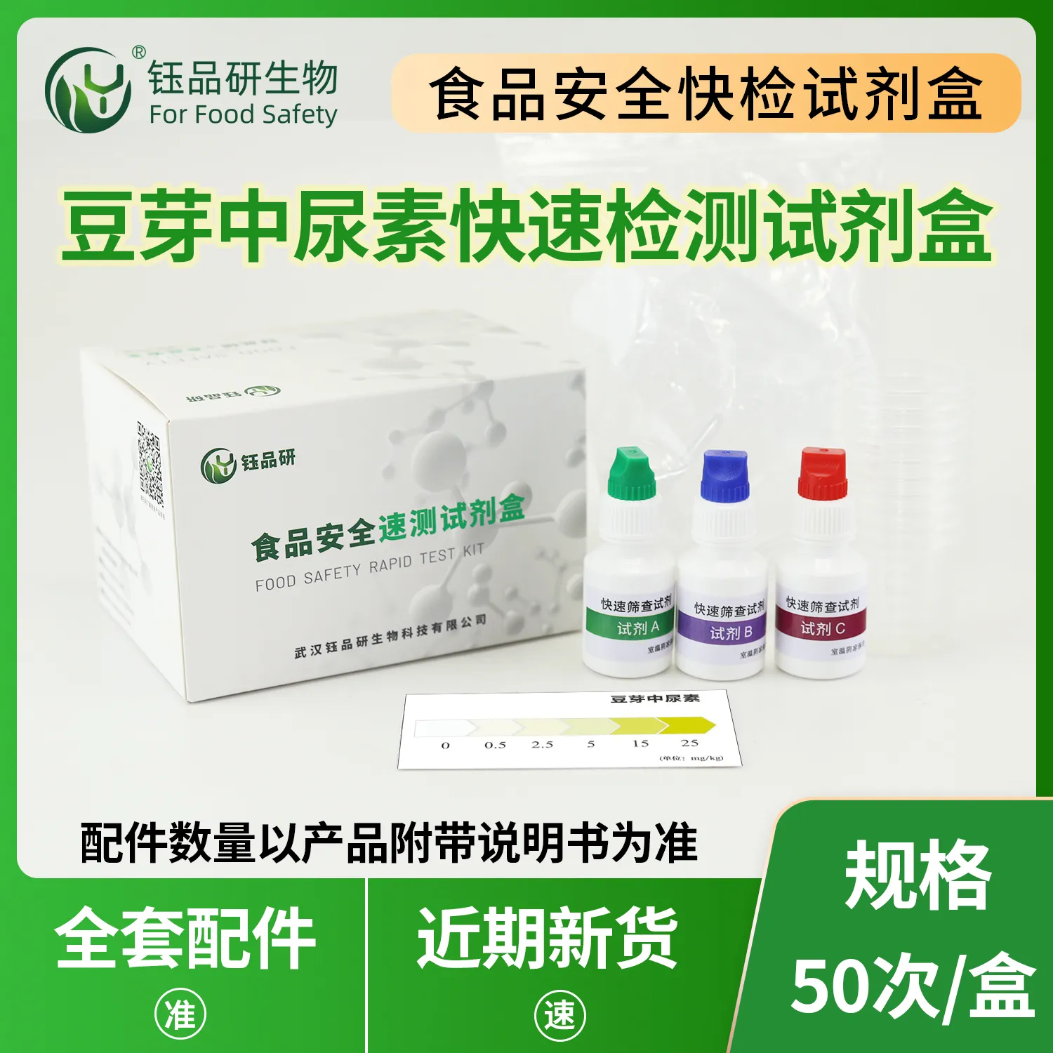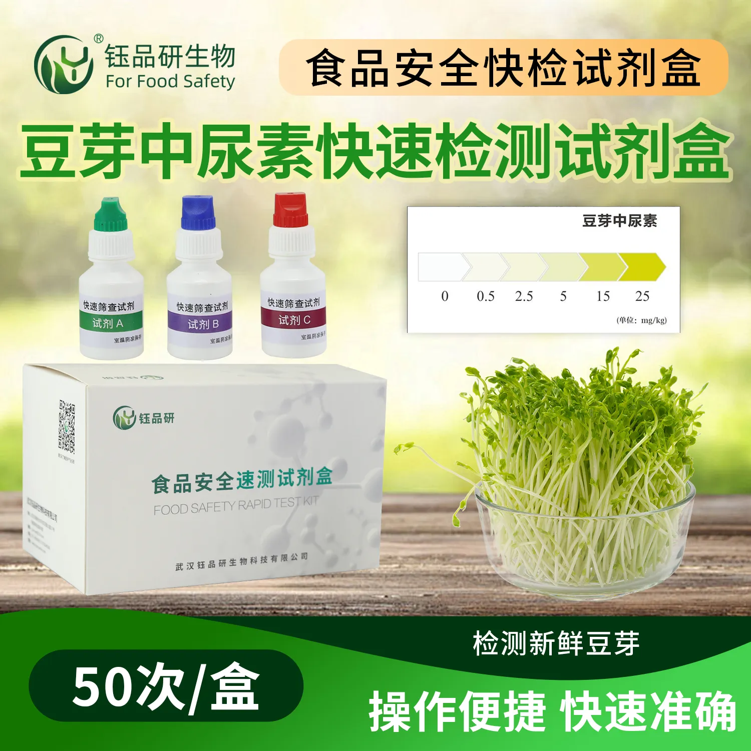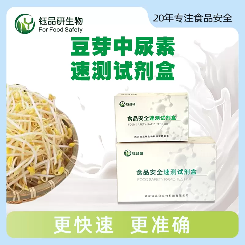 武汉钰品研生物推出豆芽中尿素速测试剂盒,基于特定试剂与尿素发生专属化学反应,借溶液颜色变化快速精准检测豆芽中是否含尿素及含量。操作简便,无需专业设备,普通人按指南,称取 3g 豆芽于样品杯,加 5ml 纯净水浸泡 2 分钟,取 10 滴浸泡液于速测管,加 2 滴检测试剂充分振摇,观察显色,含尿素溶液显黄色,且颜色随含量增加而加深。部分不法商家为促豆芽生长、增产量违规添加尿素,大量摄入会损害人体肝、肾等器官。适用于豆芽生产企业、农贸市场快检及家庭自查。咨询热线 13720286360,守护豆芽食用安全。...