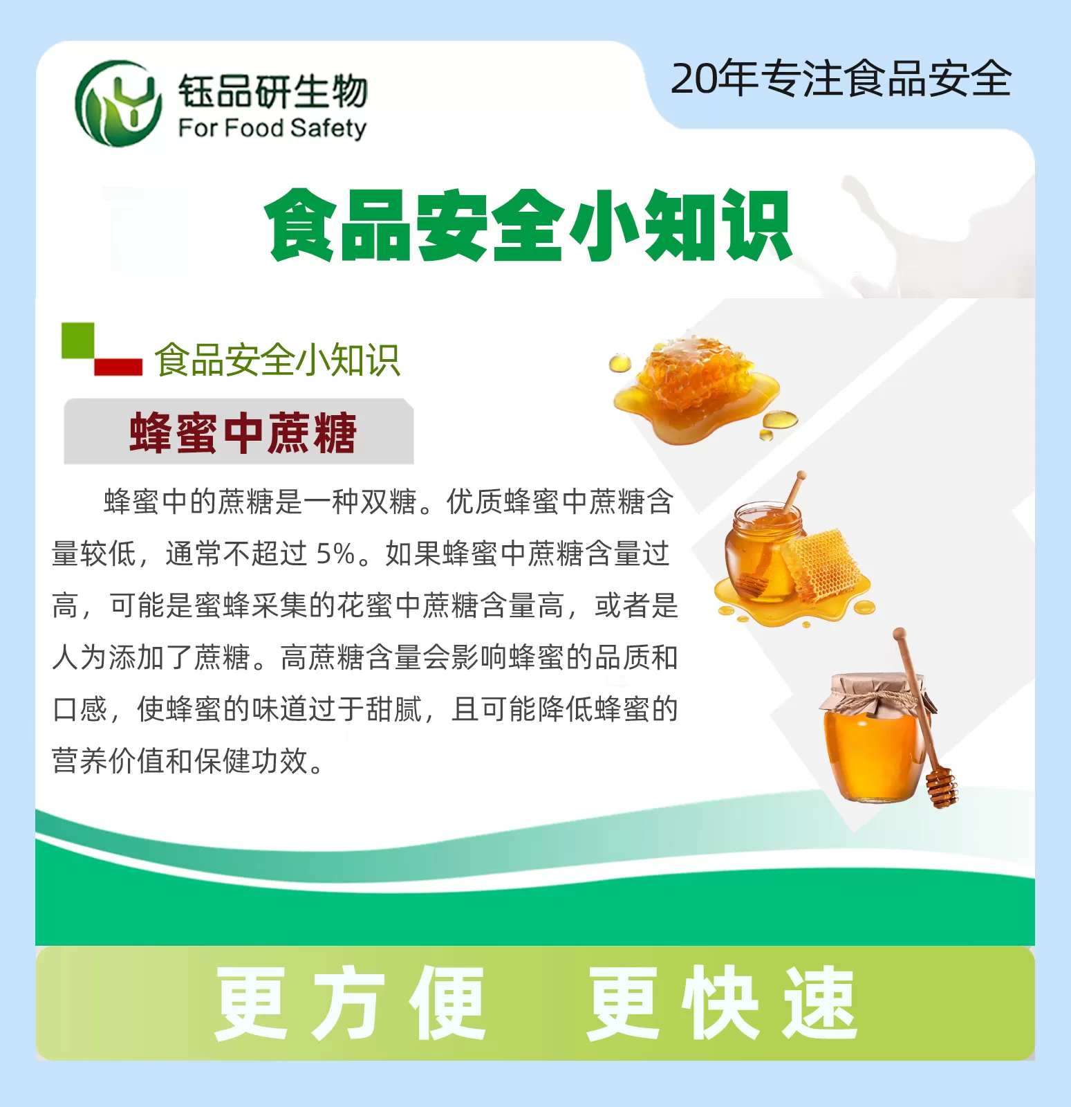 精准检测蔗糖含量,守护蜂蜜纯正品质!蜂蜜是天然的营养滋补品,其品质核心在于天然果糖与葡萄糖的含量,而蔗糖含量是判断蜂蜜是否掺假的关键指标。部分不法商家为降低成本、以次充好,违规在蜂蜜中添加大量蔗糖,不仅破坏蜂蜜的天然风味与营养结构,还可能因蔗糖过量摄入增加身体代谢负担,侵犯消费者知情权与权益。蜂蜜中蔗糖速测试剂盒,专为蜂蜜中蔗糖含量快速筛查设计,无需专业实验室与复杂设备,轻松实现便捷精准检测,为蜂蜜品质把控筑牢第一道防线,让每一口蜂蜜都纯正安心。