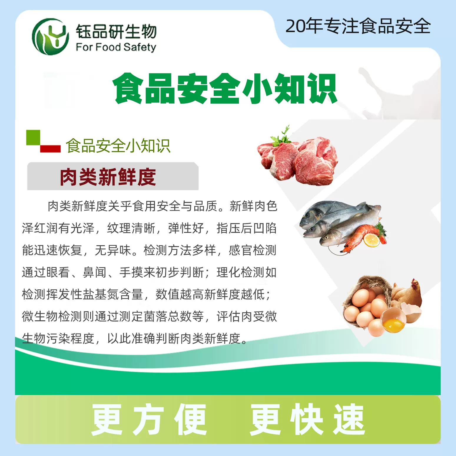 食用动物被宰杀后,在运输、储存和销售过程中由于自身因素及周围环境的影响,肉的新鲜度会逐渐降低,甚至腐败变质。本试剂盒可在短时间内检测肉类新鲜度。