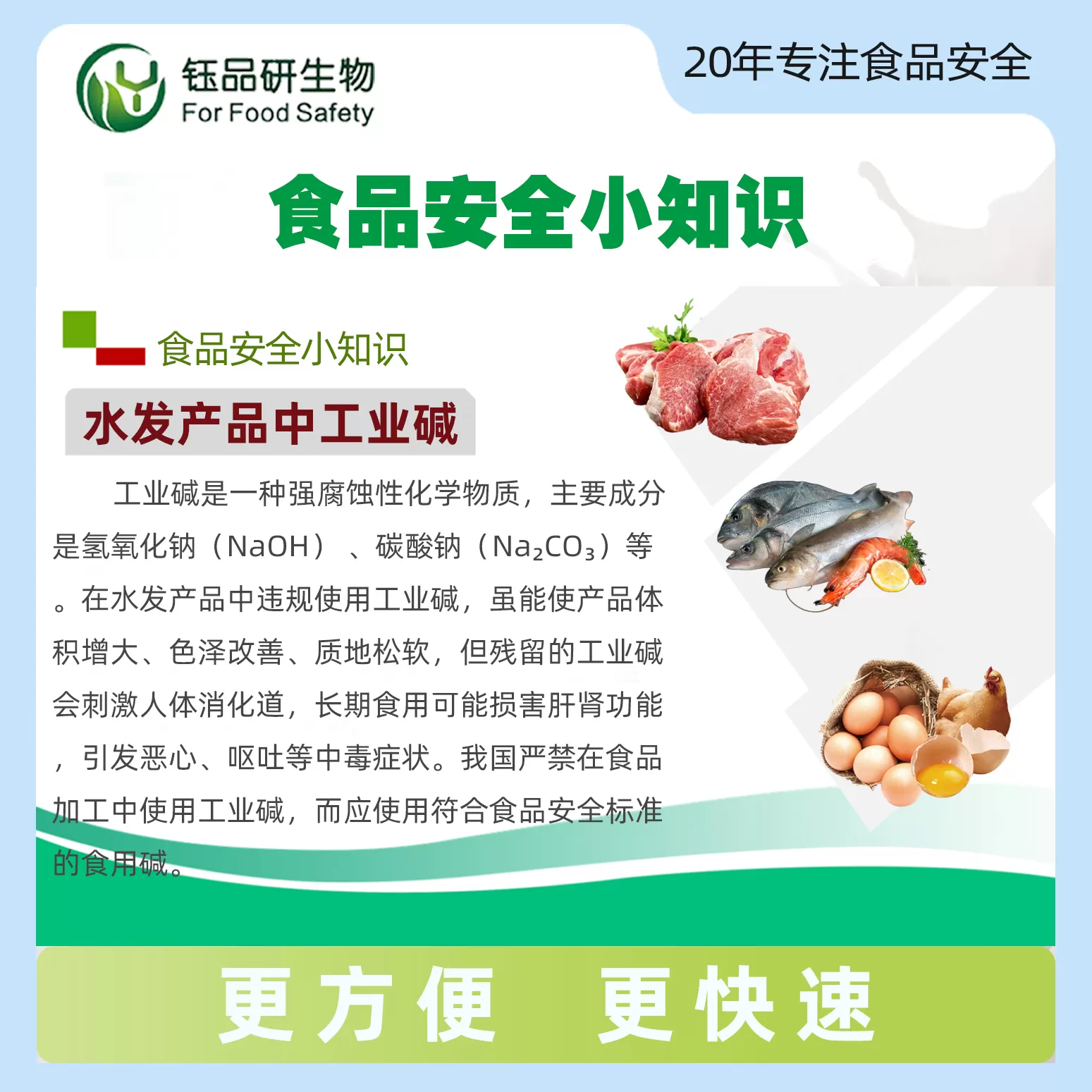 使用工业碱泡发的水发水产品pH值一般≥8.0。本试剂盒利用工业碱能使酸碱指示剂变红且不褪色的原理,以此判断呈碱性的水发水产品是否使用了工业碱泡发。